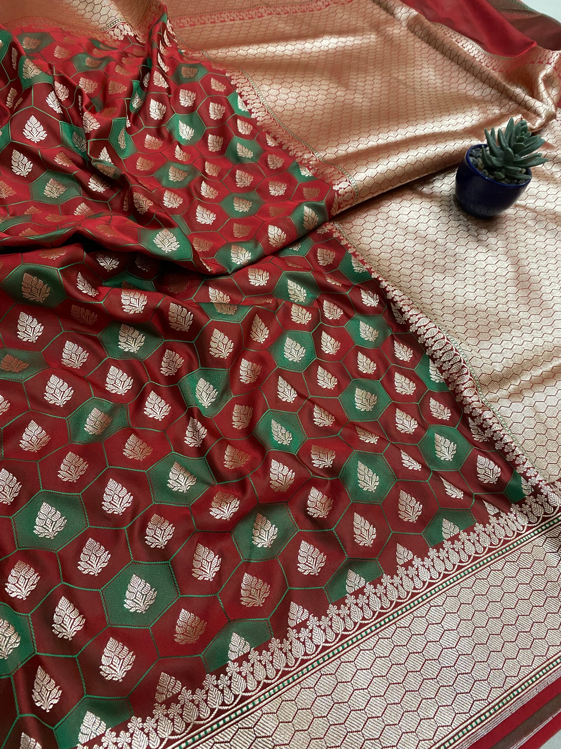 Mashru Rangkaat sareeThis Banarasi Mashru Rangkaat saree is crafted with Mashru art silk, resulting in a luxurious and elegant look. The traditional Rangkaat design adds a touch of heritage and cultural significance to this saree. Perfect for special occasions, this saree offers both comfort and style with its soft fabric and timeless design.