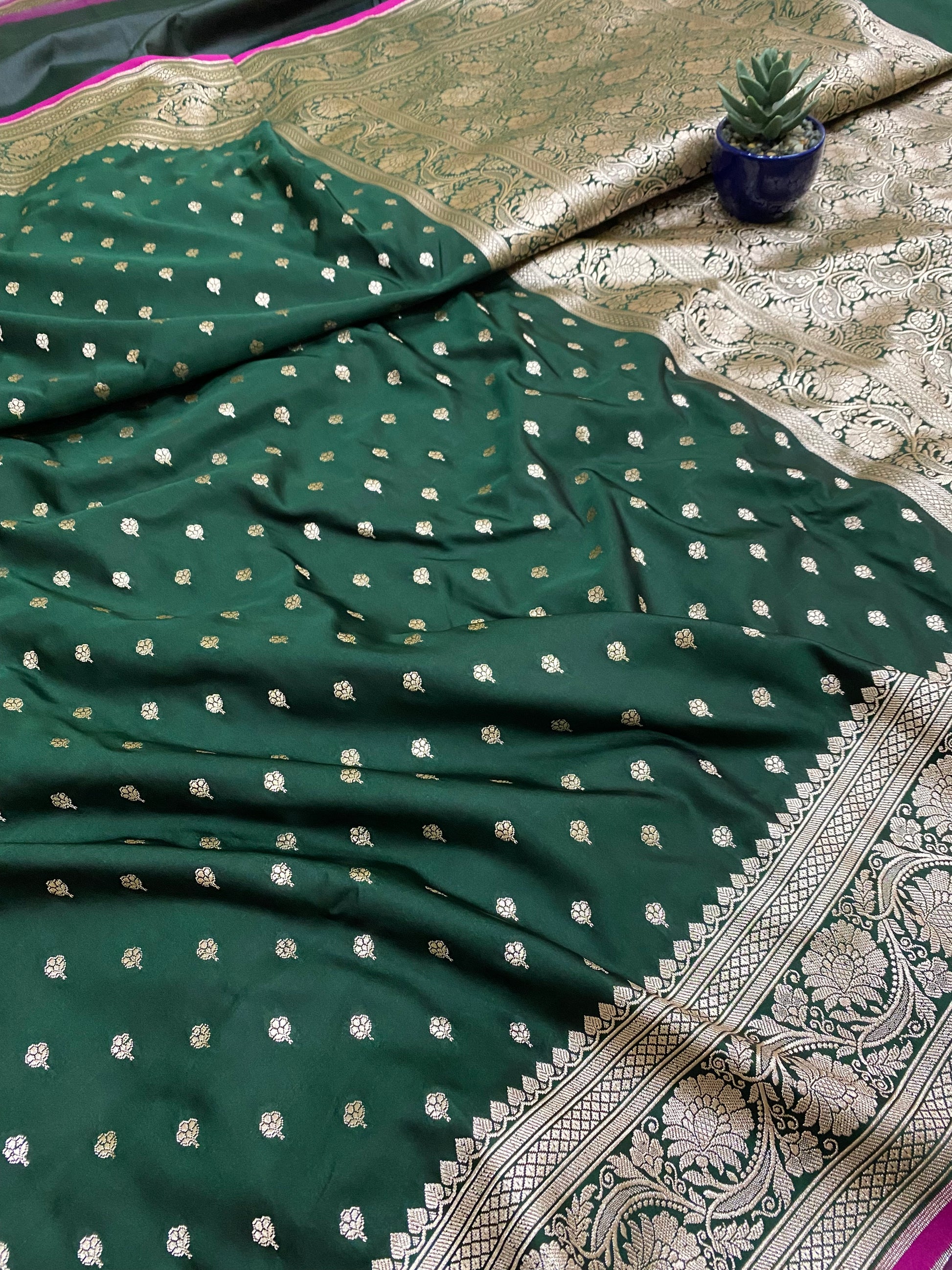Indulge in the rich and luxurious texture of our Banarasi Mashru saree. Made from the finest quality Banarasi Mashru fabric, this saree exudes elegance and sophistication. Its intricate design and smooth feel make it perfect for any special occasion. Elevate your style with this quintessential Indian saree.