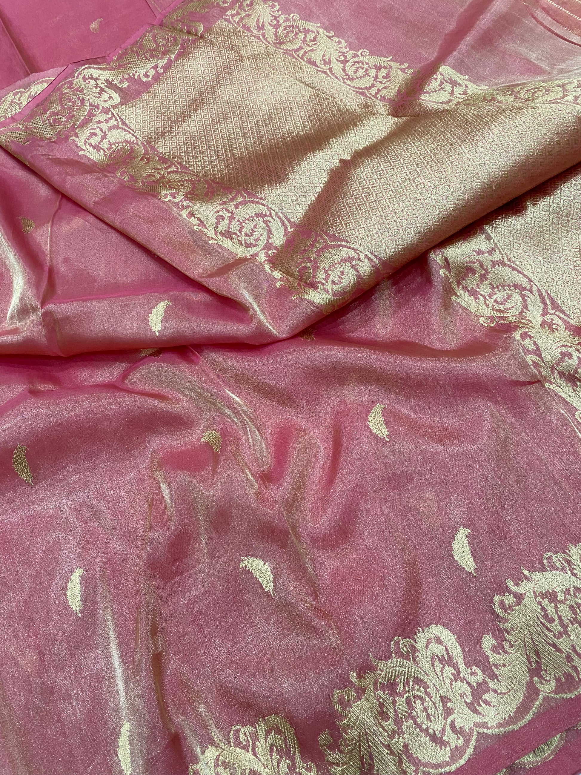 A Pure Banarasi Tissue Saree is a luxurious and elegant traditional Indian saree known for its shimmering appearance and rich craftsmanship. Here’s a detailed overview: