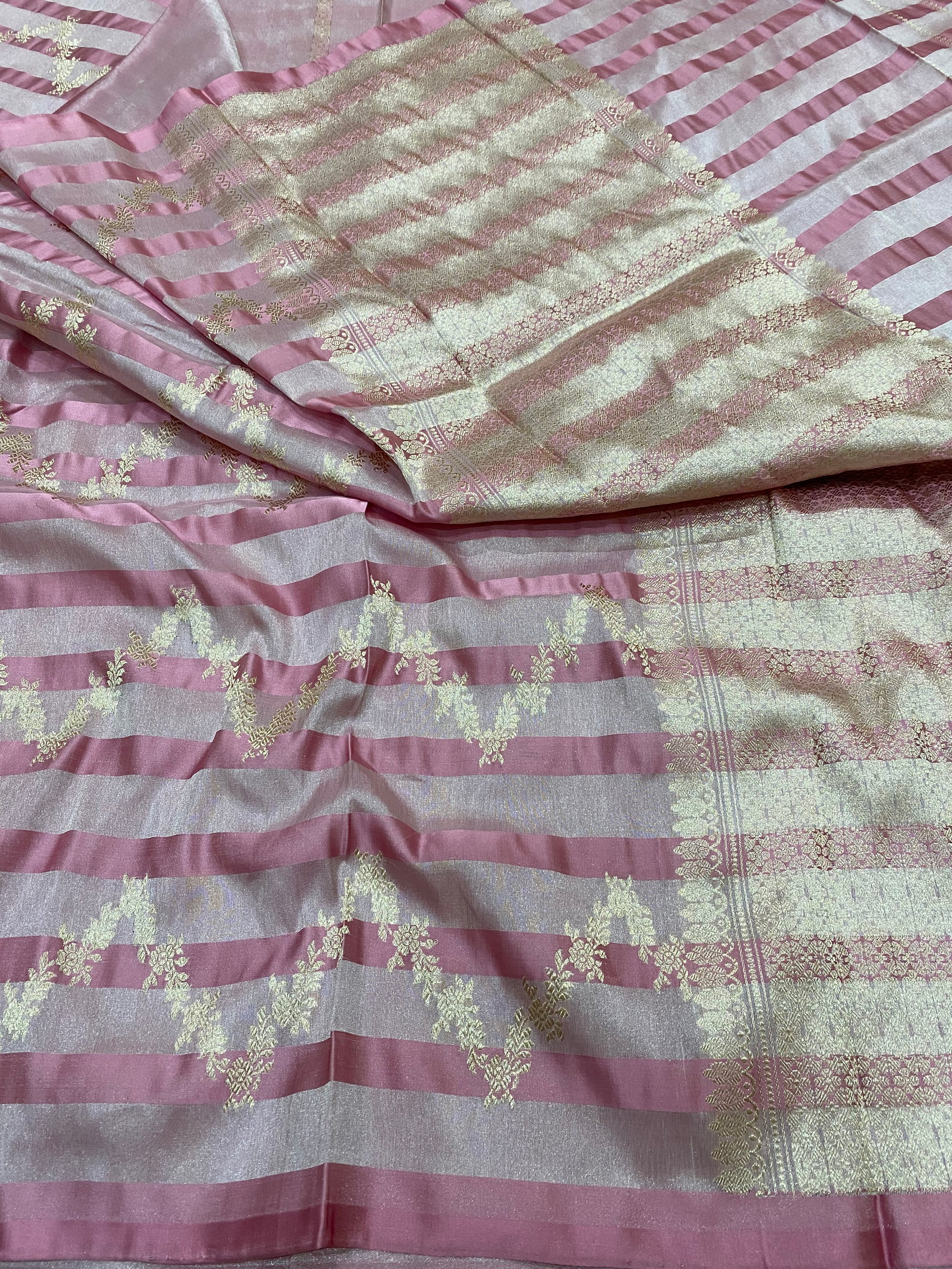 A Pure Banarasi Tissue Satin Stripe Saree combines the best of three luxurious elements: Banarasi weaving, tissue fabric, and satin stripes. Here’s a detailed look at what makes this saree special:
